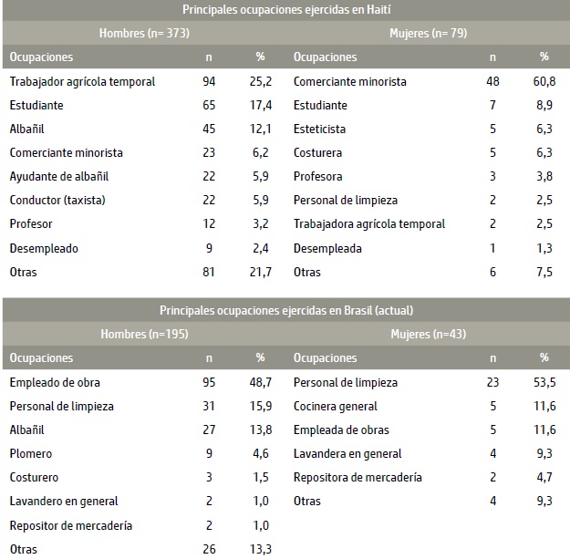 La ocupación en Haití mencionada con más frecuencia fue la de trabajador en producción agrícola y solo 10 entrevistados mencionaron que estaban desempleados. Entre los hombres, el 25,2% trabajaban en la agricultura, el 17,4% eran estudiantes y el oficio de albañil fue el tercero más citado (12,1%). Entre las mujeres, la mayoría mencionó ser comerciante (60,8%). Ya en Brasil, la mayoría de los hombres que tenía trabajo ocupaba puestos de ayudante de albañil (48,7%) y más de la mitad de las mujeres (53,5%) conformaba el grupo de personal de limpieza (Tabla 2).