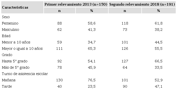 La muestra de servicios alimentarios del comedor escolar en el primer relevamiento fue de n=58 y en el segundo relevamiento fue n=57. La muestra total de niños y niñas durante los dos periodos de recolección de datos fue de n=341, que consistió en 150 niñas y niños en el primer relevamiento y 191 en el segundo relevamiento. Como se muestra en la Tabla 1, los indicadores sociodemográficos, en las dos cortes bajo análisis, siguieron una estructura similar, con un predominio del subgrupo de niñas, con edades iguales y/o mayores a 10 años, pertenecientes a cursos menores de 6° grado y al turno mañana.