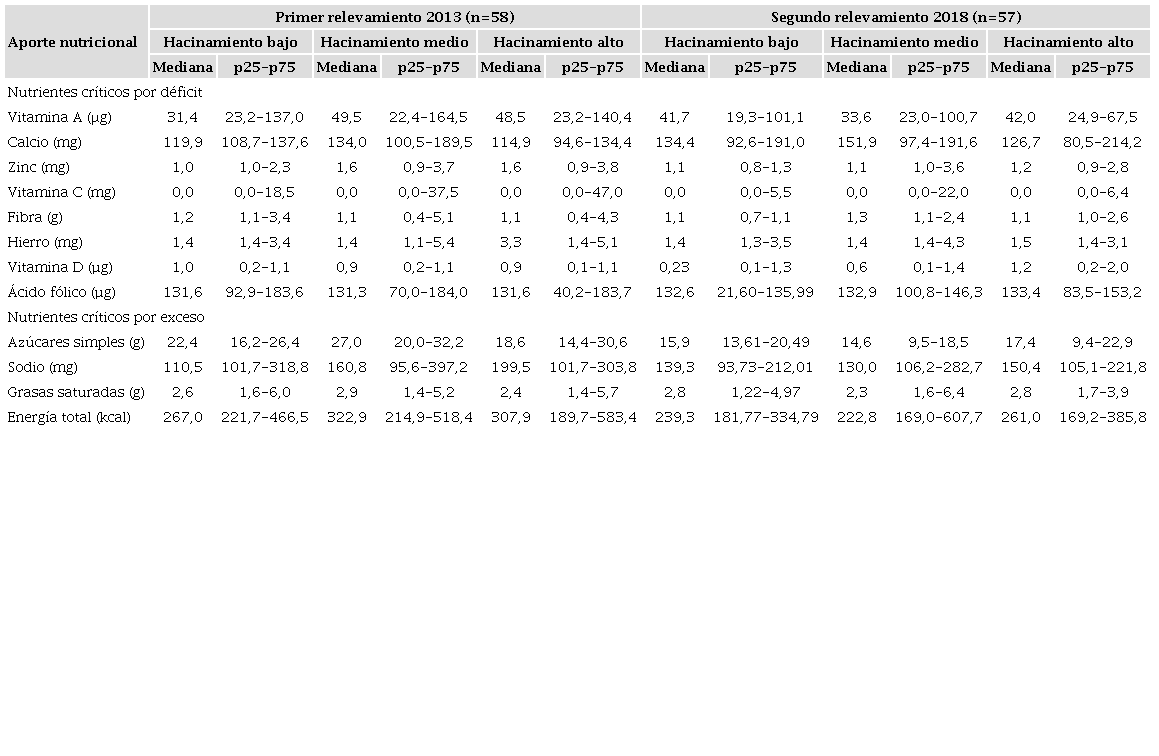 Otro dato interesante es que en el subgrupo de comedores escolares insertos en contexto de nivel alto de hacinamiento, tanto en el 2013 como en el 2018, la mediana de calcio y de vitamina D fue menor con respecto al subgrupo con nivel medio y/o bajo de hacinamiento (Tabla 2).
