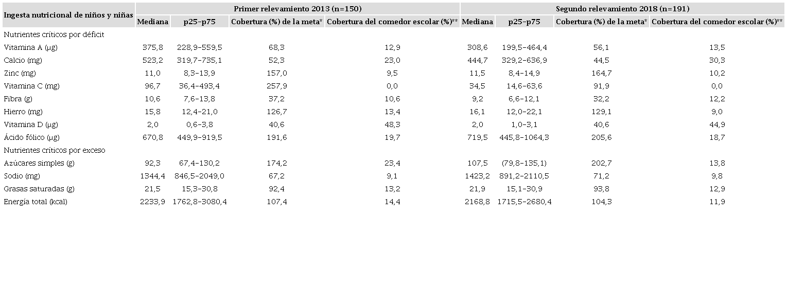 Cobertura de nutrientes por parte de la política de comedores escolares: cantidad (valores absolutos y porcentajes (%) de cobertura) de nutrientes críticos por déficit y por exceso que aportan los servicios alimentarios de comedores escolares (alimentos y bebidas ofrecidas) que representan la ingesta total de nutrientes de niñas y niños.