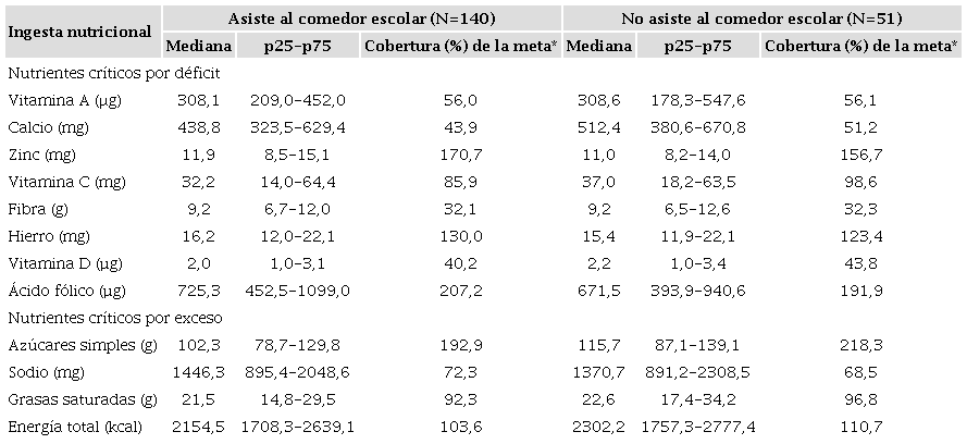 Sobre el alcance de las metas nutricionales saludables, se observó que una parte importante de los nutrientes bajo análisis, en especial el calcio, la vitamina C y la vitamina D, tanto en el grupo asistente como no asistente fue inadecuado, aunque se observó que este escenario fue más notorio en el subgrupo que asistió al comedor escolar.