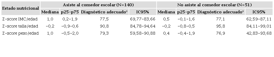 En la Tabla 5, se incorpora una columna que representa la proporción de niñas y niños con “diagnóstico adecuado” tanto en el subgrupo de asistentes como no asistentes al comedor escolar en cada uno de los Z-score bajo análisis (IMC/edad, talla/edad y peso/edad) siguiendo los lineamientos de la OMS. En cuanto al estado nutricional, se observaron diferencias en los percentiles en el subgrupo asistente versus no asistente al comedor escolar como, por ejemplo, en el caso del Z-score peso/edad. El primer grupo tuvo una mediana de 1,0 y, en el segundo, una mediana de 0,4. El percentil talla/edad en el grupo asistente tuvo una proporción de la muestra con diagnóstico adecuado del 90,8% y un 95,8% en el no asistente, mientras que el percentil IMC/edad fue más elevado en el primer grupo con respecto al segundo (Tabla 5).
