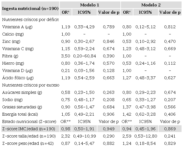 En cuanto a la relación explorada entre la ingesta de las niñas y los niños y la asistencia al comedor escolar (modelos ajustados por potenciales confusores) si bien no se encontraron asociaciones estadísticamente significativas, se observó que en nutrientes críticos por exceso, en el grupo expuesto al comedor escolar, las grasas saturadas tuvieron un OR de 1,37 y la energía total un OR de 1,42, y también se vio un OR aumentado en el no alcance de las metas de otros nutrientes críticos por déficit, como la vitamina C y el ácido fólico en los asistentes a comedores escolares.