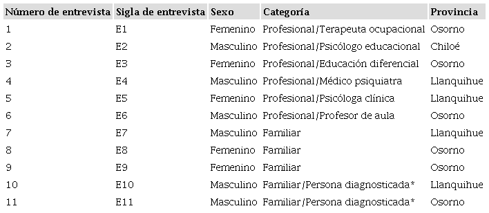 Se aplicaron once entrevistas en profundidad a profesionales, familiares y adolescentes diagnosticados con TDAH. Dichos actores pertenecían a tres provincias de la región de Los Lagos: Llanquihue, Osorno y Chiloé. Estas entrevistas, se construyeron en relación con los objetivos de la investigación, y se establecieron tres aspectos relevantes a indagar: significados del diagnóstico, configuraciones del diagnóstico e implicancias del diagnóstico.