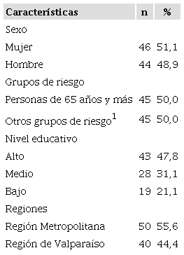 Entre septiembre de 2020 y enero de 2021 se realizaron 90 entrevistas semiestructuradas a personas residentes en las regiones de Valparaíso y Metropolitana, consideradas como las más pobladas y densas del país. Asimismo, estas regiones presentan gran movilidad de población y concentran un alto porcentaje de personas mayores38. Se conformó una muestra teórico-intencional37, integrada por personas pertenecientes a los siguientes grupos de riesgo por COVID-19: a) personas de 65 años y más; b) personas con diabetes y/o hipertensión mayores de 18 y menores de 65 años (Tabla 1)