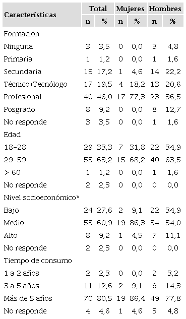 Con respecto a las características sociodemográficas de las personas donantes de las muestras, en la Tabla 1 se puede observar que 22 fueron mujeres, 63 hombres, mientras 2 personas no respondieron la categoría sexo; que la mayoría de las personas que contribuyeron con la donación de las muestras tenía formación profesional o de postgrado y se ubicaba en un rango de edad entre los 29 y 59 años. Destaca además que el 70% de las personas donantes pertenecían al nivel socioeconómico medio (estrato 3-4) o alto (estrato 5-6) de acuerdo con la estratificación socioeconómica en Colombia25. El 80,5% de los consumidores llevaban más de 5 años consumiendo la sustancia.