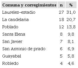 Las 87 muestras recolectadas en el marco del Programa de Salud Pública Juvenil de la Secretaría de la Juventud de Medellín se obtuvieron en seis de las 16 comunas del área urbana de la ciudad, y en dos de los cinco corregimientos que conforman la zona rural. De acuerdo con la Tabla 2, los territorios urbanos aportaron el 83,9% (73) de las muestras y la zona rural el 16,1% (14).
