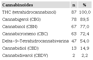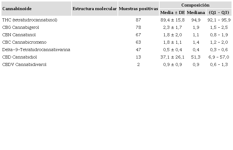 La estructura y composición de cada uno de los fitocannabinoides se puede observar en la Tabla 4. La presencia de THC en el 100% de las muestras y de CBG en 78 de ellas, sigue un patrón lógico, teniendo en cuenta que el mayor componente de los cannabinoides en material vegetal es de THC y por su parte el CBG proviene del CBG ácido, primer fitocannabinoide que se biosintetiza después de la formación de ácido olivetólico, siendo el precursor de los demás cannabinoides en la planta26. No obstante, y a pesar de que el THC presentó una media de 89,4% de la composición total de cannabinoides de las 87 muestras, el CBD cannabinoide terapéutico no psicoactivo tuvo una media de 37,1%, porcentaje promedio nada despreciable en la composición total de las 13 muestras en que estuvo presente. La presencia promedio de los demás cannabinoides (CBG, CBN, CBC, CBDV y el Delta-9-Tetrahidrocannabivarina) fue inferior al 2,3%.