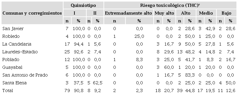 De acuerdo con la legislación actual colombiana, todas las muestras cuantificadas estarían clasificadas como material psicoactivo debido a que la concentración de THC supera el 1% p/p (Tabla 5). La gran mayoría de las muestras cuantificadas (90,8%) corresponden a un quimiotipo I rico en el cannabinoide THC, por lo que estas principalmente tienen efectos psicotrópicos. Un porcentaje del 9,2%, correspondiente a 8 muestras, presentó quimiotipo II rico en CBD (mayor contenido de CBD que de THC), por lo cual es posible presumir que estas poseen menos efectos psicotrópicos sobre el organismo al contrarrestarse estos últimos con los efectos terapéuticos generados por las altas concentraciones del cannabinoide medicinal. Específicamente, las 8 muestras ricas en CBD reportaron contenidos de este cannabinoide en el rango de 4,7 a 9,6% p/p. Las comunas en las cuales se recolectó mayor cantidad de muestras de material vegetal de cannabis fueron Laureles-Estadio, La Candelaria y Poblado. De manera general, la mayor parte de las muestras (44,8%) presenta riesgos toxicológicos altos con relación a la concentración de THC presente.