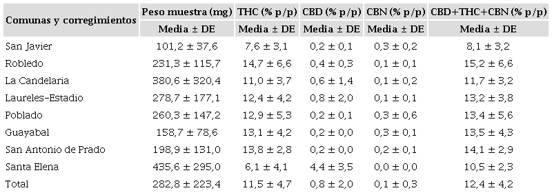 De las seis comunas en las que se captaron muestras, las comunas ubicadas sobre el costado occidental (Laureles, Guayabal, Robledo y San Javier) aportaron el 58,9%. Por su parte, las comunas ubicadas al oriente de la ciudad (La Candelaria y Poblado) contribuyeron con el 41,1%. El corregimiento de San Antonio de Prado suministró el 42,8% de las muestras procedentes de la zona rural. El número de muestras reunidas y su dispersión espacial permitieron obtener un panorama amplio de los cannabinoides presentes en la marihuana que se consume en la ciudad de Medellín.