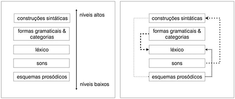 Em nossa argumentação, a tradução revela um sistema multinível de relações. A noção de multiplex, de restrições inter-níveis que atuam em sistemas hierárquicos complexos, pode ser muito adequada à descrição desse fenômeno (Martinčić-Ipšić, Margan & Meštrović, 2016). A tradução revela aquilo que Jakobson chamou de “equação verbal” (categorias sintáticas e morfológicas, raízes, fonemas e marcas distintivas), e que já descrevemos, em outros trabalhos (Atã & Queiroz, 2016), como um sistema multinível de restrições – diferentes níveis de organização correspondem a diferentes conjuntos de estruturas e processos que, assimetricamente, se restringem (determinam, constrangem) (ver Figura 1).