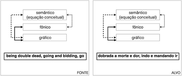 O que pode ser definido como “fisicalidade do signo” (fonte e alvo) tem a forma de um sistema de restrições, uma “equação conceitual” que “encontra eco e ícone / nas camadas fônicas e gráficas do poema” (ver Figura 2). Tal propriedade, tipicamente diagramática, é muito claramente manifesta na práxis criativa, de Haroldo e Augusto de Campos. O objeto revelado (“urdidura subjacente”, Campos 1986: 76-77) da tradução é uma relação internível, selecionada no estoque de alternativas disponíveis (ou inventadas) no signo-alvo (português), em um novo acervo de relações.