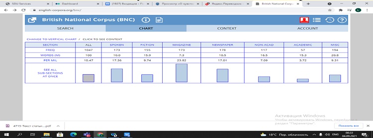 It corresponds to the English concept of duty, which is similar but not the same to the Russian долг because of its shades of meanings and collocations in Russian: honor/venerate smb’s memory. * The first thing, in the first place (in Russian it is a colloquial expression) – first of all, uppermost, initially; firstly, at first; from / at the beginning (This system of meanings is represented in Ozhegov’s Dictionary, which is one of the well-known Russian dictionaries). Charge, commitment, duty, incumbency, liability, obligation. In general, person’s duty contains moral imperative related to God, citizen’s duty and duty of the family man; all these types of duty can be compared with borrowed money or things … Duty is rather general, whereas liability is private, personal; debt involuntary, the duty is conditional; something, which should be done unconditionally because of public interests and/or moral certainty’ Syn.: obligation, commitment. (Thesaurus of Great Russian Language by V. Dal, 2009). In the British National Corpus, there are 7806 entries for the duty (see Picture 1Duty in the British National Corpus, which shows the representation of duty in a variety of texts) whereas for the debt there are 4301 entries only despite the popularity of financial and business texts.
