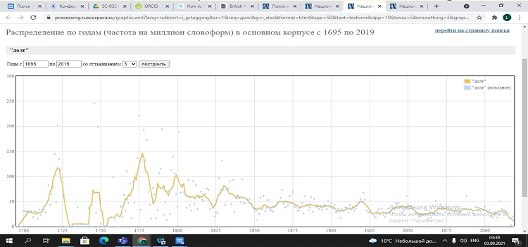 In the Russian National Corpus, the dynamics of word perception shows that the peak of its use took place at the end of the XVIII century, and after that it showed the downward trend; otherwise, it is still one of the most frequently used concepts in Russian language (thus, in 2012 the frequency was 32,02 per million as it is shown on the Picture 2Долг/duty, debt in the Russian National Corpus):