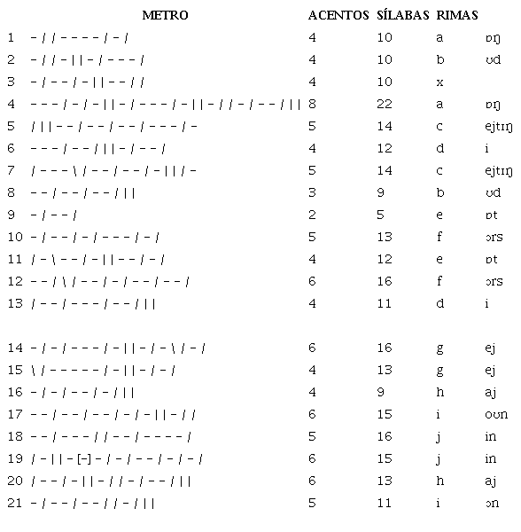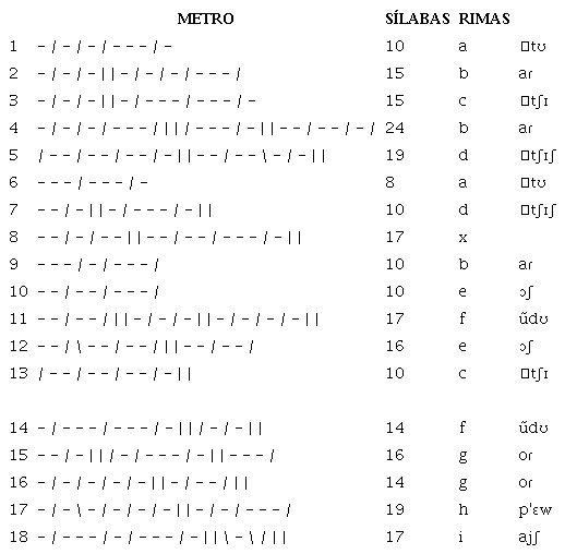 Na coluna principal, reproduzimos a escansão do poema, com a marcação dos acentos primários (/) e secundários (\) e das pausas sintáticas (| |) no interior de cada verso. Nas duas colunas seguintes, registramos, respectivamente, o número de acentos e de sílabas encontrados no verso em questão. Na próxima coluna, indicamos o esquema de rimas. Na última, representamos as sequências de fonemas que correspondem às rimas.