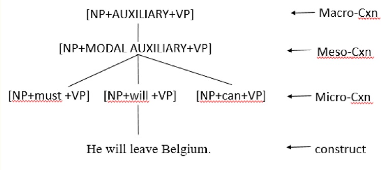 Furthermore, grammatical generalisation can also be obtained through “taxonomic relations” and “inheritance relations”. It is worth noting that verbal predicate constructions with greater generality comprise both transitive and intransitive verb constructions. In this case, a typical example is the comparison between “tickle” and “die”. Since “tickle” is a transitive verb, it can be understood a construct or instances of the construction [Sbj tickle Obj] and further abstracted from a higher-stratified construction of [Sbj Trverb Obj]. The intransitive verb “die” derives from a semi-stratified construction of [Sbj Die] and a fully general construction of [Sbj IntrVerb]. In representing a translational picture, the primary goal of RCG is to break down ST into constructions, evaluate the way they are glued together in SL, and re-express them in TT by reassembling the constructions according to the TL rules. While the process of deverbalising must be carried out from top to bottom, the strategy during the re-expression phase is from bottom to top, using the constructions on the bottom line as a starting point. This paper agrees that the analytical step should start with the basic constructions, condensing schematic constructions at the top level. Then the constructional equivalence between SL and TL is achieved from top to bottom, namely from meso-constructions (Cxn) to micro-constructions (Cxn).