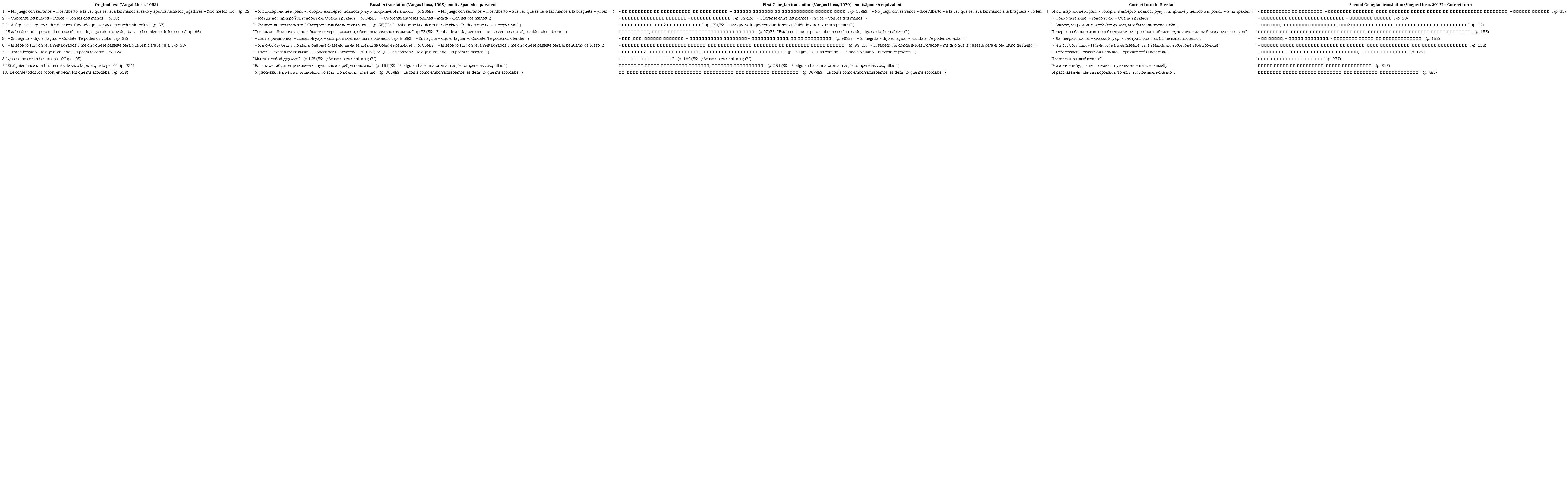 In addition to the cuts in the novel, the altered paragraphs are clearly noticeable in order to alleviate the vocabulary or sexual episodes. These episodes are alleviated by other, relatively less rude expressions of the words or by removing a few phrases. The table below shows the changes made to the text. The first column contains the original text from the first edition of the novel. The second - its Russian translation and also the Spanish equivalent of the Russian translation (this text does not exist in Spanish, the translation of these changes was done within the framework of the study), the third column contains the text of Georgian translation in 1979 and its Spanish equivalent, the fourth - Russian equivalent of the Spanish original text (this text does not exist in Russian, the translation of these changes was done within the framework of the study), so to speak, the correct form, and the fifth - the text of the second Georgian translation, which is translated from the original Spanish. The level of Georgian translation in 2017 allows us to use the text of the mentioned translation as the correct Georgian equivalent of the original. The table below shows ten of the 25 changes made by the censors.