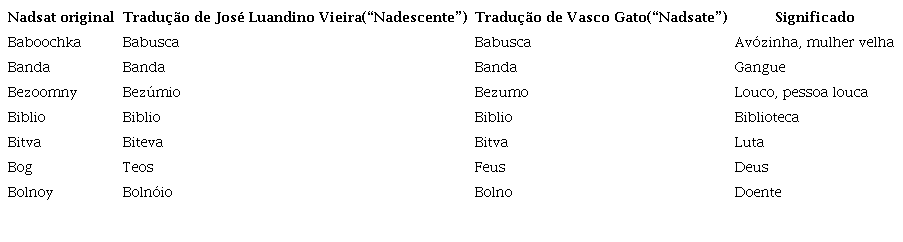 Assinalamos a existência de casos excecionais nos quais os tradutores elegeram outra “solução criativa”, ao invés de uma acoplagem entre o russo e o português. Na tradução de Vasco Gato tal é visível, por exemplo, em: “cusco” (no original kot) e “Feus” (no original Bog).