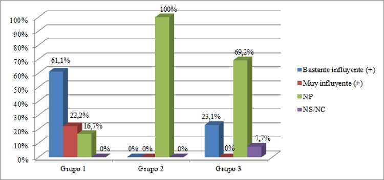 Dado el elevado porcentaje de estudiantes que escogieron la opción “NP” para indicar que no asistieron a tutoría, consideramos de utilidad ofrecer porcentajes válidos, es decir, calculados tratando las respuestas “NP” y la respuesta en blanco como valores perdidos. De acuerdo con estos porcentajes válidos, del total de estudiantes que acudieron a tutoría, el 77,8% (73,3% en el Grupo 1 y 100% en el Grupo 3) señalan que esta práctica influyó bastante y de forma positiva en sus creencias de autoeficacia y el 22,2% (26,7% en el Grupo 1) consideran que la asistencia a tutoría resultó muy influyente (y positiva).