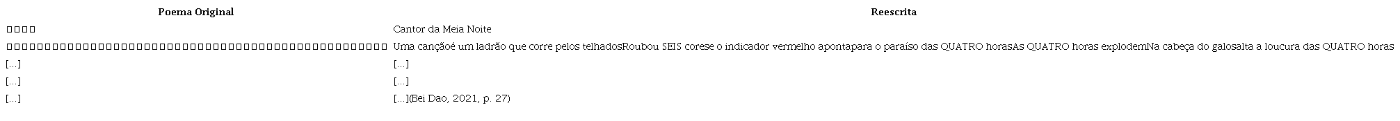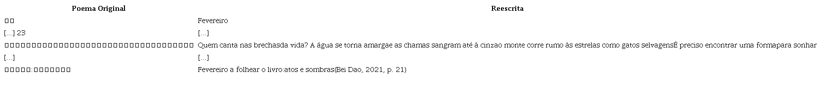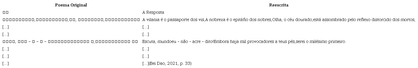 Se a consideração do contexto histórico é fundamental para a leitura da poesia de Bei Dao, um processo pré-tradução, o contexto linguístico, ideológico, poético e cultural, por sua vez, é um elemento decisivo para fixar as normas e estratégias da tradução da poesia de Bei Dao e delineia o processo da tradução, o que também é a ideia central da “reescrita”. Dado que será a primeira vez que a tradução da poesia de Bei Dao entra no mercado da língua portuguesa e a cultura chinesa nunca fora uma cultura forte no polissistema literário da língua portuguesa, adotamos o princípio de fazer uma “tradução aceitável” de forma que rescrevemos as chinesidades atendendo aos hábitos dos leitores da língua portuguesa e mantemos as chinesidades compreensíveis. Algumas traduções podem ser uma traição ao texto original ou uma interpretação excessiva, mas é uma estratégia importante para a tradução ser atraente e bem-aceite. No entanto, segundo Júlio Reis Jatobá (2019): “A poesia é imagem, traduzir é alteridade” (2019, p. 145), a reescrita dos poemas de Bei Dao é justamente um reaparecimento, em vez de uma cópia, das imagens poéticas no contexto do português e a alteridade é imprescindível.