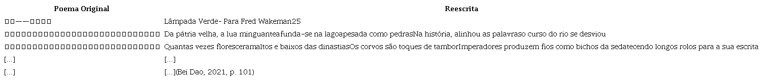 Nesta seção, apresentaremos uns exemplos de tradução (ET) com o intuito de mostrar as estratégias para a reescrita dos conteúdos com a presença da cultura ocidental (ET-1) e com a chinesidade (ET-2, 3, 4). Aproveitamos aqui o conceito de “reescrita” proposto por André Lefevere (1992) porque julgamos que a tradução da poesia de Bei Dao não é uma transferência simples entre as línguas, ao contrário, é uma reescrita considerando integralmente os fatores linguísticos, poéticos, culturais e ideológicos, entre outros.