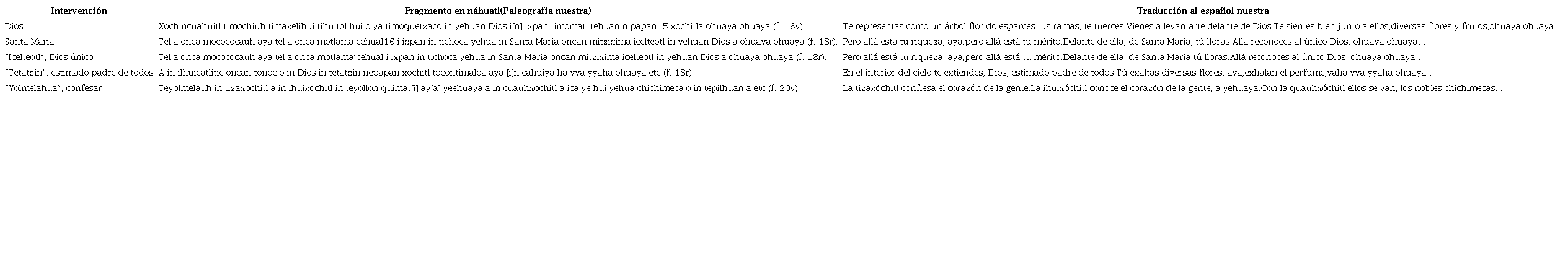 Las intervenciones católicas en los cantos prehispánicos, ya sean en español o en el náhuatl clásico, reflejan la compleja labor epistémica y traductológica de los misioneros lingüistas. “Dios” fue, quizás, el concepto de la cristiandad que más esfuerzos exigió del grupo de traducción. Inicialmente se tradujo por “teotl”, como se observa en el tercer ejemplo de la tabla, “icelteotl”, precedido del adverbio “icel” que significa “solo”, “solo uno”. Sin embargo, poco tiempo después se optó por su eliminación para evitar la asociación con las divinidades nahuas. Sahagún lo advierte: “porque a cualquiera criatura que vían ser iminente en bien o en mal, la llamaban teutl; quiere decir ‘dios’” (Sahagún, 2016, p. 603). Se adoptó, por ende, el término en español, “Dios”, la forma más común en el manuscrito, o su forma integrada al vocativo en náhuatl: “Diosé”. La madre de Dios, “Santa María”, a su vez, obedeció a los mismos criterios de conservación del vocablo en español, evitando establecer cualquier equivalencia con las madres de los dioses del panteón nahua, no obstante está frecuentemente asociada con el vocablo “ichpochtli”, del náhuatl “doncella”, “mujer moza”, “moza virgen”.