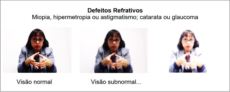 Em seguida, veremos quatro quadros com imagens que representam as principais condições da pessoa com visão subnormal, e os comentários sobre tipos de comunicação e estratégias, considerando o diálogo ou a comunicação por meio da interpretação para línguas de sinais.