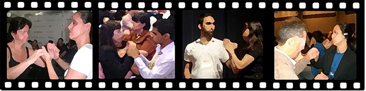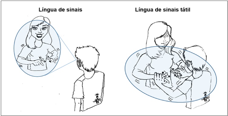 Na imagem, a seguir, apresentamos a comparação da percepção/recepção das articulações entre a língua de sinais e da língua de sinais tátil, com o exemplo do sinal da Libras “trabalhar”. Na interação em língua de sinais, o interlocutor focaliza o todo do corpo do sinalizante; já na língua de sinais tátil, a atenção da recepção está na articulação das mãos e braços, em movimento coativo de percepção sinestésica.