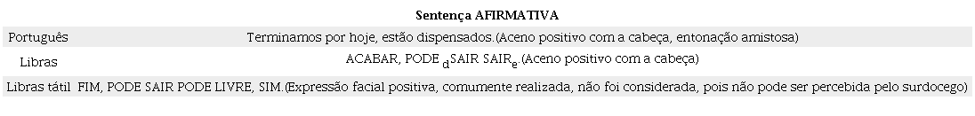 Na situação em que uma pessoa ouvinte ou surda participa de um evento e o evento é finalizado, mesmo que estas pessoas não tenham prestado atenção no enunciado “estão dispensados”, ao observar os demais se movimentando, guardando seus pertences nas bolsas e se levantando, elas têm certeza de que o evento terminou. Entretanto, a pessoa surdocega não acompanha toda essa informação, que é visual e precisa ser comunicada de forma clara e assertiva. Muitas vezes, mesmo o guia-intérprete, por meio da Libras tátil, comunicando o fim da palestra ou do evento, a pessoa surdocega não se levanta, tende a aguardar mais informações para ter certeza do encerramento, com o intuito de não passar constrangimentos, ou pede a confirmação se os demais participantes estão se movimentando. O surdocego pode não querer se levantar enquanto os demais ainda estão sentados ou pode querer confirmar a informação para poder se dirigir a uma pessoa próxima, evitando fazê-lo enquanto as apresentações ainda estão acontecendo. Dessa forma, a partir desse exemplo e das observações do estudo, fazemos o apontamento de que as construções afirmativas na língua de sinais tátil também precisam ser bem marcadas.