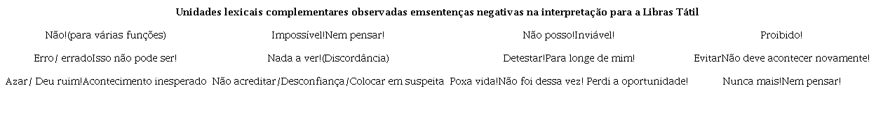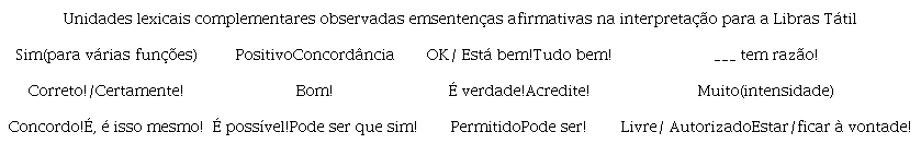 Apresentamos, no quadro a seguir, as unidades lexicais observadas na interpretação de português para a Libras tátil para sentenças afirmativas em diferentes recortes. Mesmo que estes sinais sejam considerados como parte do léxico comum, essas unidades lexicais foram consideradas morfologicamente correspondentes e/ou complementares prosódicos, pois assumiram outras funções na organização sintático-semântica, como, por exemplo, na ocorrência de reduplicação de termos, na redundância e no uso de léxico específico, configurando-se como linguagem expressiva. É interessante ressaltar que, quanto mais fortes são as marcações prosódicas, mais a construção em Libras tátil se reelabora para dar conta da entonação expressiva e faz uso de diferentes sinais manuais, aparentemente sobressalentes nas sentenças que observamos.