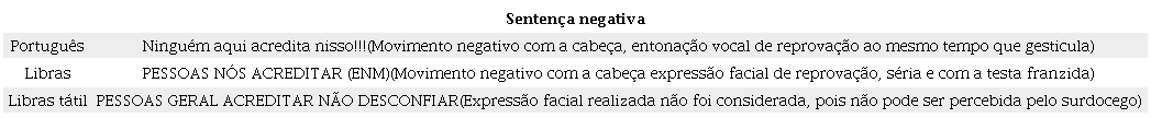 Sob a mesma perspectiva, no quadro a seguir, apresentamos um recorte com sentença “negativa”, com a mesma organização: a informação na língua fonte, o português, reformulada em Libras e, na última linha, a sentença na Libras tátil.