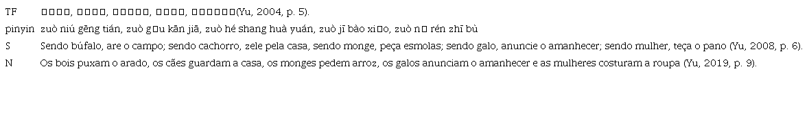 Diferentemente do português, cuja gramática tradicional exige hipotaxe na distribuição das frases, o chinês não costuma utilizar palavras de ligação, e as frases não são restringidas por uma estrutura sujeito-predicado rigorosa. Em vez de exigir uma estrutura lógica quanto à construção de frases, o chinês se focaliza mais na coerência inerente. A frase original na tabela 1 é composta por cinco orações curtas de quatro ou cinco caráteres. Cada oração começa com o verbo “做” (zuò, ser/fazer), que prevê a regra e o destino da vida de todos os seres, contendo uma conotação interna de que “o boi deve arar o campo, o cão deve guardar a casa, o monge deve pedir esmolas, o galo deve anunciar o amanhecer e a mulher deve tecer o pano”. Além de adicionar uma suave pausa entre o sujeito e o predicado para o leitor poder sentir a coerência inerente, esta ênfase do verbo na posição inicial da frase incorpora o pensamento fatalista do confucionismo, que divide a vida de uma pessoa em seis partes: “[...] aos 15 anos, empenhei-me no estudo. Aos 30, estabeleci-me. Aos 40, já não tinha dúvidas. Aos 50, compreendi o Mandato do Céu. Aos 60, meus ouvidos estavam afinados. Aos 70, (consegui) seguir o que desejava meu coração, sem infringir as regras” (Confúcio, 2012, p. 33). Segundo Giorgio Sinedino, o tradutor da obra, o “Mandato do Céu” é o “destino” e a “Ordem que o Céu dá a cada um” (Confúcio, 2012, p. 34).