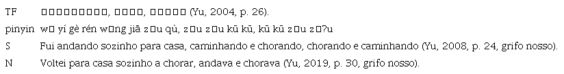 A linguagem de Yu Hua no romance Viver (Yu, 2004) é simples, concisa e sem inquietação, sendo capaz de despertar, por meio das experiências vividas pelos personagens no romance, a empatia junto aos leitores. Em Viver, Yu Hua recorre a uma grande quantidade de palavras com carga cultural que possuem formatos e estruturas, que, por um lado, são típicas na língua chinesa e mostram uma grande simplicidade e fluidez para os leitores da LF e, por outro, são difíceis de traduzir pela sua única estrutura sintática e peculiar estilo linguístico. Para além de suas funções semânticas, essas palavras são empregues para pôr em destaque uma ação, uma ideia ou uma emoção dos personagens, e até certo ritmo da redação ou alguma rima da escrita especial, ao longo do desenvolvimento do enredo e da caraterização dos personagens. Veja-se a tabela 1, em que são evidenciados o texto fonte (TF), o pinyin (sistema de transliteração fonética oficialmente usado pela China), a tradução de Schmaltz (S) e a de Nabais (N):