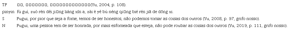 Na tabela 3, o substantivo“良心” (liáng xīn) em chinês se refere às normas de conduta e aos padrões de valores reconhecidos de forma universal pela sociedade chinesa. Como um conceito confucionista, “良心” é uma combinação de todas as restrições morais e normas comportamentais. No TF, quando a China se encontrava numa época difícil e muitas pessoas sofriam de fome, a filha surda-muda de Fugui, Fengxia, retirou uma batata doce da terra. Contudo, Wang Si, com a intenção de ficar com a batata doce, aproveitou a deficiência física de Fengxia mentindo que esta lha tinha roubado. Fugui defendeu a filha, mas os outros acreditaram nas palavras de Wang Si e disseram a Fugui o TF na tabela 3. Com base no contexto, o significado de “良心” é próximo de “honestidade”. Quanto a “做人得讲良心” (zuò rén děi jiǎng liáng xīn), a tradução de Schmaltz é “temos de ser honestos” enquanto a tradução de Nabais é “uma pessoa tem de ser honrada”. Ambos os tradutores adotam a tradução livre, destacando um dos significados da palavra neste contexto. Por outro lado, é difícil encontrar um equivalente da palavra “良心” em português e se se traduzisse literalmente, causar-se-iam mal-entendidos junto dos leitores do TA. Portanto, ambos os tradutores alcançam uma boa transformação na dimensão cultural.