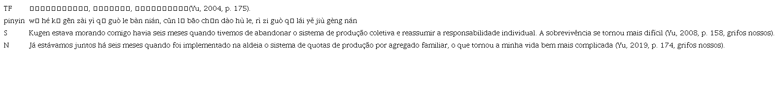 “包产到户” (bāo chǎn dào hù, fixar cotas de produção agrícola para cada família)2 na tabela 4 foi uma política exclusiva da China e intimamente relacionada com sua realidade econômica e social do fim da década de 1970 e início da década de 1980. Foi implementada nas regiões rurais no âmbito da política de reforma e abertura do país. A política previa que os camponeses tivessem o direito de gerir a terra, organizando diferentes atividades de produção por conta própria. Tirando os impostos agrícolas, o resto da colheita era propriedade de cada família. Antes disso, fora implementado nas regiões rurais o sistema de Comuna Popular, e segundo o qual tudo era compartilhado com base na produção coletiva. Com a nova política, que mudou da produção coletiva para a produção por agregado familiar, a situação econômica da família de Fugui se piorou, devido à falta da mão de obra, pois eram apenas duas pessoas na família. Como os leitores do TA podem não conhecer essa parte da história chinesa, convém fazer uma transformação adaptativa na tradução a fim de permitir aos leitores do TA entenderem a relação entre “包产到户” e a dificuldade financeira cada vez maior de Fugui.