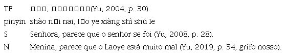 No entanto, ambas as traduções podem ser otimizadas a partir da transformação na dimensão comunicativa. A primeira solução é adotar a estratégia de domesticação, em que se mantém a tradução de Schmaltz sobre “老爷” (lǎo ye) e traduz “少奶奶” para “jovem senhora”. O segundo procedimento incide na transliteração de Nabais, mantendo “Laoye” para “” e traduzindo “” para “Shaonainai”, adicionando uma anotação explicativa.