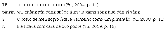 Schmaltz substitui a imagem de “松花蛋” por “pimentão” para ilustrar claramente a raiva do sogro, especificando a cor vermelha do “pimentão” e criando uma comparação razoável, pois todos os leitores do TA sabem que a cor vermelha do rosto representa na maioria dos casos a irritação. Nabais, por sua vez, tenta manter a imagem de “松花蛋” no TA, mas traduz para “ovo podre”, que não corresponde ao TF e, ainda por cima, embora os leitores de língua português talvez conheçam o ovo podre, não poderão estabelecer a relação entre a cor do ovo podre e a reação do sogro. Posto isto, a tradução de Nabais não chega a fazer a transformação na dimensão comunicativa, sendo que a versão de Schmaltz alcança a intenção comunicativa do TF.