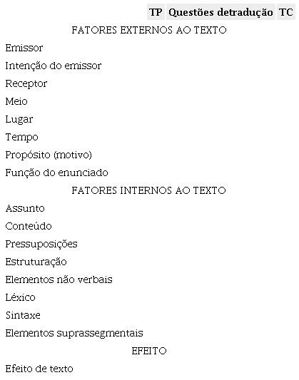Fatores extratextuais: fatores pragmáticos, externos ao texto — emissor (quem?), intenção do emissor (para quê?), receptor (para quem?), meio (por qual meio?), lugar (onde?), tempo (quando?), propósito (por quê?) e função de enunciado (com qual função?);