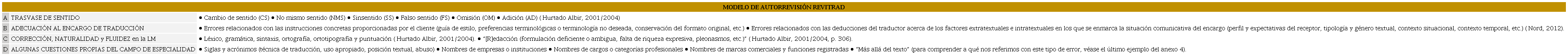 Seguidamente, se presenta el contenido de la plantilla de autorrevisión, diseñada en formato de Excel. Así, para cada una de las traducciones realizadas y autorrevisadas se abría una hoja diferente del archivo y cada una de estas hojas incluía los apartados que se muestran en la siguiente tabla.