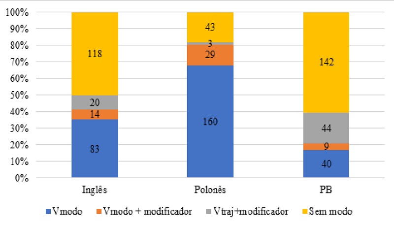 Os dados apresentados e analisados acima nos levam a duas conclusões principais. A primeira delas confirma a hipótese da maior frequência (Gráfico 1) de verbos que expressam modo de movimento nos textos escritos nas línguas-S. Enquanto nos textos em inglês e em polonês mais de 40% dos verbos usados nos eventos de movimento estão veiculando modo, no texto em português encontramos somente 21% desse tipo de verbos. No caso da língua polonesa, essa porcentagem chega até 80%, refletindo a quase obrigatoriedade da indicação de modo nessa língua eslava.