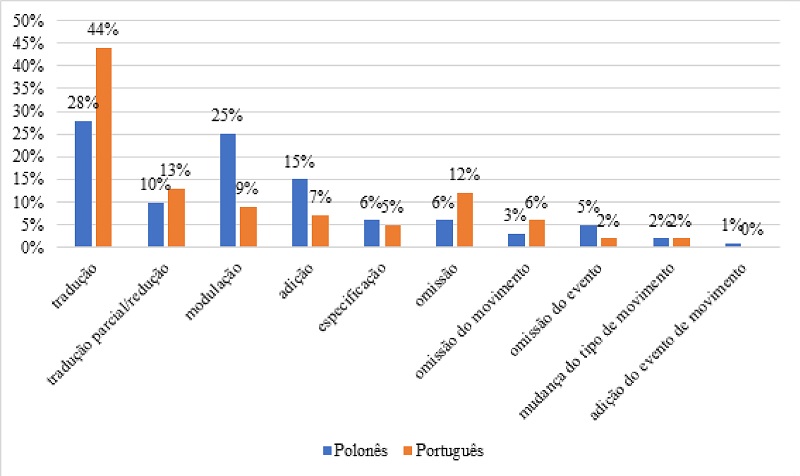 Para compreender melhor as decisões tradutórias tomadas em vista das diferenças da saliência de modo entre as línguas envolvidas, vejamos abaixo a relação das técnicas tradutórias aplicadas pelas tradutoras referentes a esse componente semântico de movimento. A quase obrigatoriedade da indicação do modo de movimento na língua polonesa fez com que a tradutora polonesa precisasse adicionar o modo em todos os casos da tradução dos verbos ingleses “to go”, “to come” e “to get to”. Já que 30% de todos os eventos traduzidos são desse tipo e considerando que não se trata nesses casos de uma decisão, mas de uma obrigatoriedade, eles foram retirados dos dados apresentados abaixo: