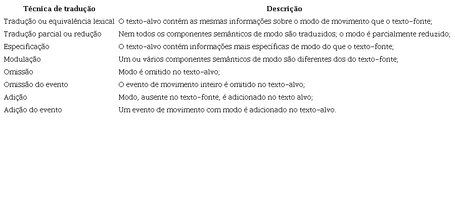 Palavras-chave: Análise de tradução, padrões de lexicalização de modo de movimento, técnicas de tradução.