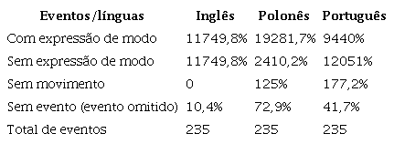 No corpus sob escrutínio foram identificados 235 eventos de movimento, cuja distribuição de expressão do componente modo está apresentada na Tabela 1: