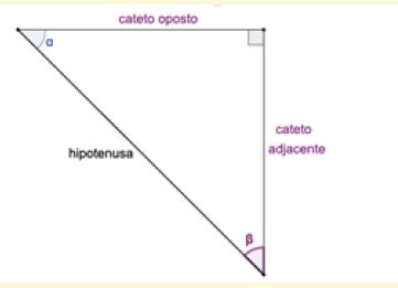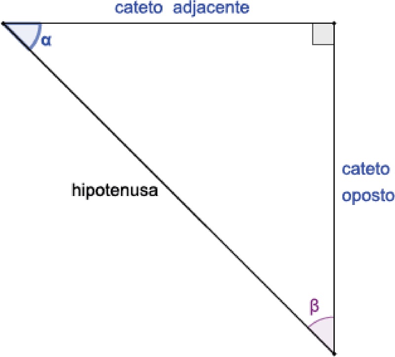 Considerando o ângulo α (Figura 4), o lado que se encontra à sua frente é chamado de cateto oposto. O lado adjacente (“que está ao lado”) de α é chamado de cateto adjacente: