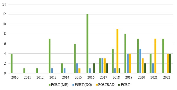 Observa-se (Gráfico 1), no que diz respeito às pesquisas dos ETILS, que: (i) as primeiras pesquisas foram defendidas na PGET (04 dissertações), no ano de 2010; (ii) a PGET mantém pelo menos uma defesa anual no período pesquisado (2010-2022), sendo o programa com mais pesquisas defendidas (87); (iii) a primeira pesquisa no POSTRAD é defendida em 2015 e na POET em 2016; e (iv) a partir de 2015, há um total expressivo de pesquisas anualmente defendidas, com a média de quatorze (14) por ano.