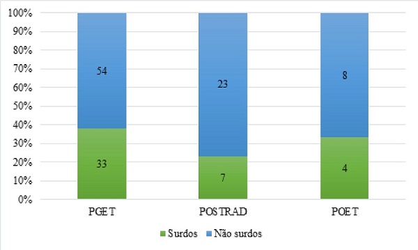 Observa-se (Gráfico 2) que a autoria surda está presente em todos os programas. Considerando-se o total das produções de cada programa, no âmbito dos ETILS, temos o seguinte: (i) 37,9% de autoria surda na PGET-UFSC (33 trabalhos); (ii) 23,3% de autoria surda no POSTRAD-UnB (07 trabalhos); e (iii) 33,3% de autoria surda na POET-UFC (04 trabalhos). Se considerarmos as 129 pesquisas dos ETILS que foram mapeadas, temos que 34,1% das pesquisas na pós-graduação brasileira em Estudos da Tradução foram realizadas por pessoas surdas (44 trabalhos).