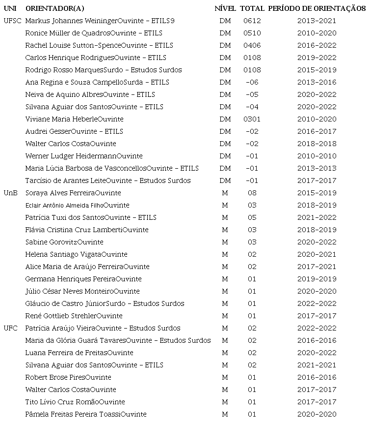 Vale mencionar, aqui, que Walter Carlos Costa e Silvana Aguiar dos Santos integram dois programas de pós-graduação, a saber a PGET na UFSC e a POET na UFC, tendo orientado pesquisas nos ETILS em ambos. Outro aspecto interessante diz respeito à quantidade de pesquisas orientadas. Nesse quesito, destacam-se Markus Johannes Weininger e Ronice Müller de Quadros que orientaram, respectivamente: dezoito (18) pesquisas, sendo seis (6) doutorados e doze (12) mestrados; e quinze (15) pesquisas, sendo dez (10) doutorados e cinco (5) mestrados, todas na PGET-UFSC, defendidas entre 2010 e 2021.