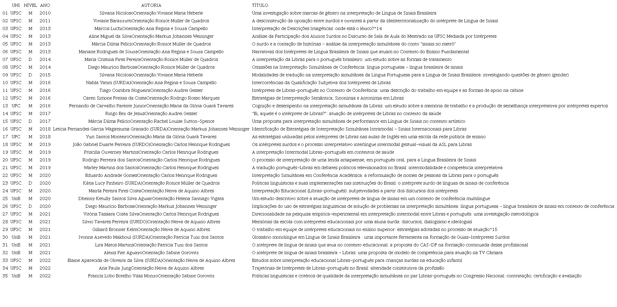 Santos, Silvana Aguiar dos. Tradução/Interpretação de Língua de Sinais no Brasil: uma análise das teses e dissertações de 1990 a 2010. 2013. Tese (Doutorado em Estudos da Tradução) – Centro de Comunicação e Expressão, Programa de Pós-graduação em Estudos da Tradução, Universidade Federal de Santa Catarina, Florianópolis, 2013. https://repositorio.ufsc.br/handle/123456789/122677.