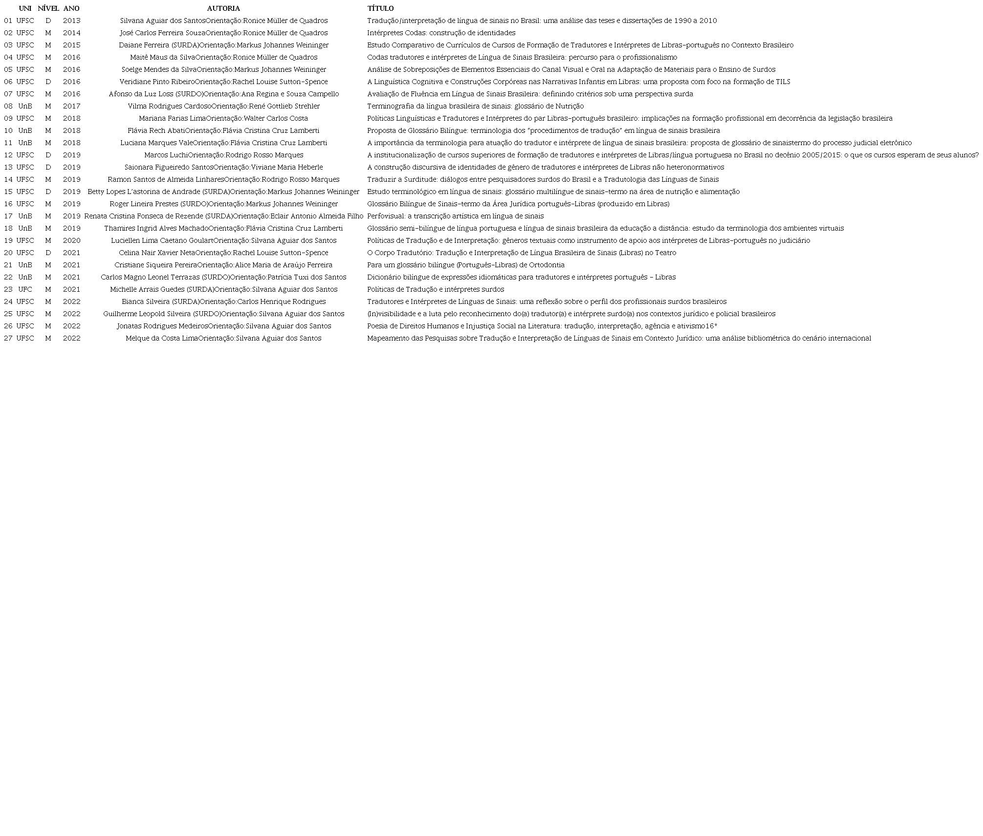 Esses dados são relevantes visto que evidenciar a participação de mulheres e de pessoas surdas na produção de pesquisas no âmbito dos ETILS, em programas de pós-graduação em Estudos da Tradução, pode contribuir significativamente com sua visibilidade e reconhecimento no meio acadêmico, assim como com a valorização de sua contribuição para os avanços e o enriquecimento do campo, indo de encontro a perspectivas misóginas ou capacitistas.