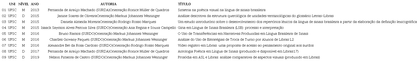 Observamos (Quadro 6) a seguinte distribuição dos trabalhos referentes aos temas não específicos dos ETILS, mas que estão vinculados às línguas de sinais e às comunidades surdas, sendo nove (09) trabalhos no âmbito da PGET-UFSC: três (3) teses e cinco (6) dissertações, versando sobre diferentes temas nos âmbitos da Linguística, da Linguística Aplicada e da Literatura.